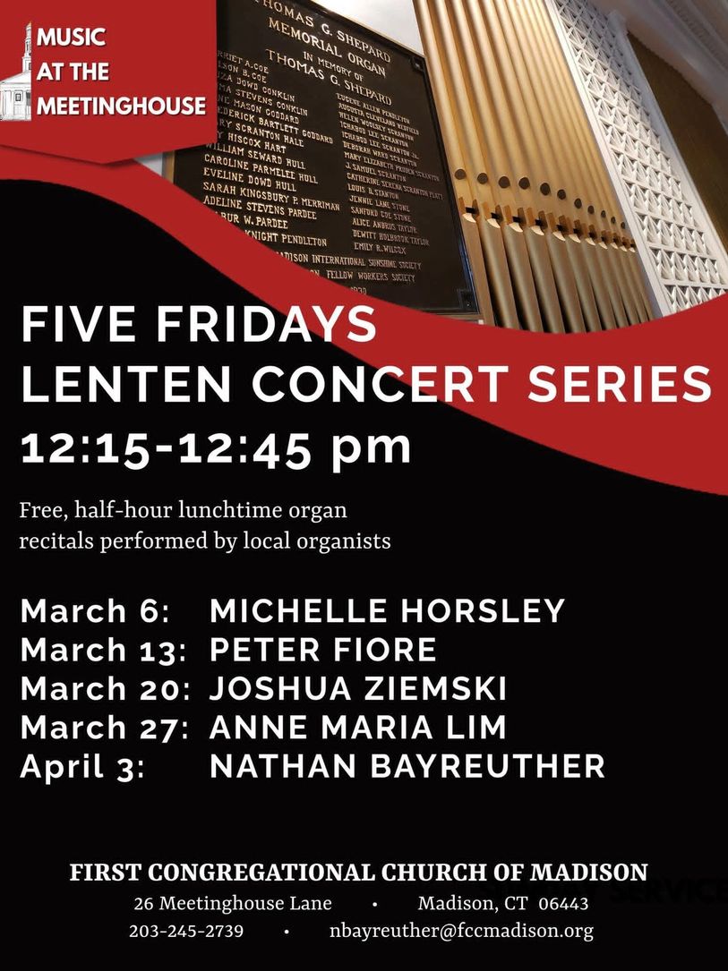 The New London Chapter AGO is one of the sponsors of the Five Fridays Lenten Concert Series at the First Congregational Church of Madison.